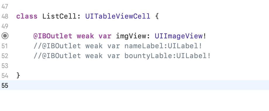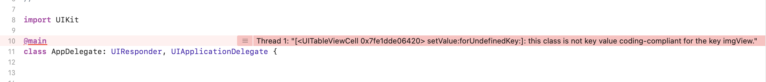 니노z 2021. 6. 21. 23:44Thread 1: "[<UITableViewCell 0x7fe1dde06420> setValue:forUndefinedKey:]: this class is not key value coding-compliant for the key imgView."