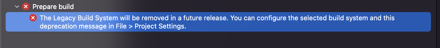 Xcode error - The Legacy Build System will be removed in a future release. You can configure the selected build ststem and this deprecation message in File > WorkSpace Settings.