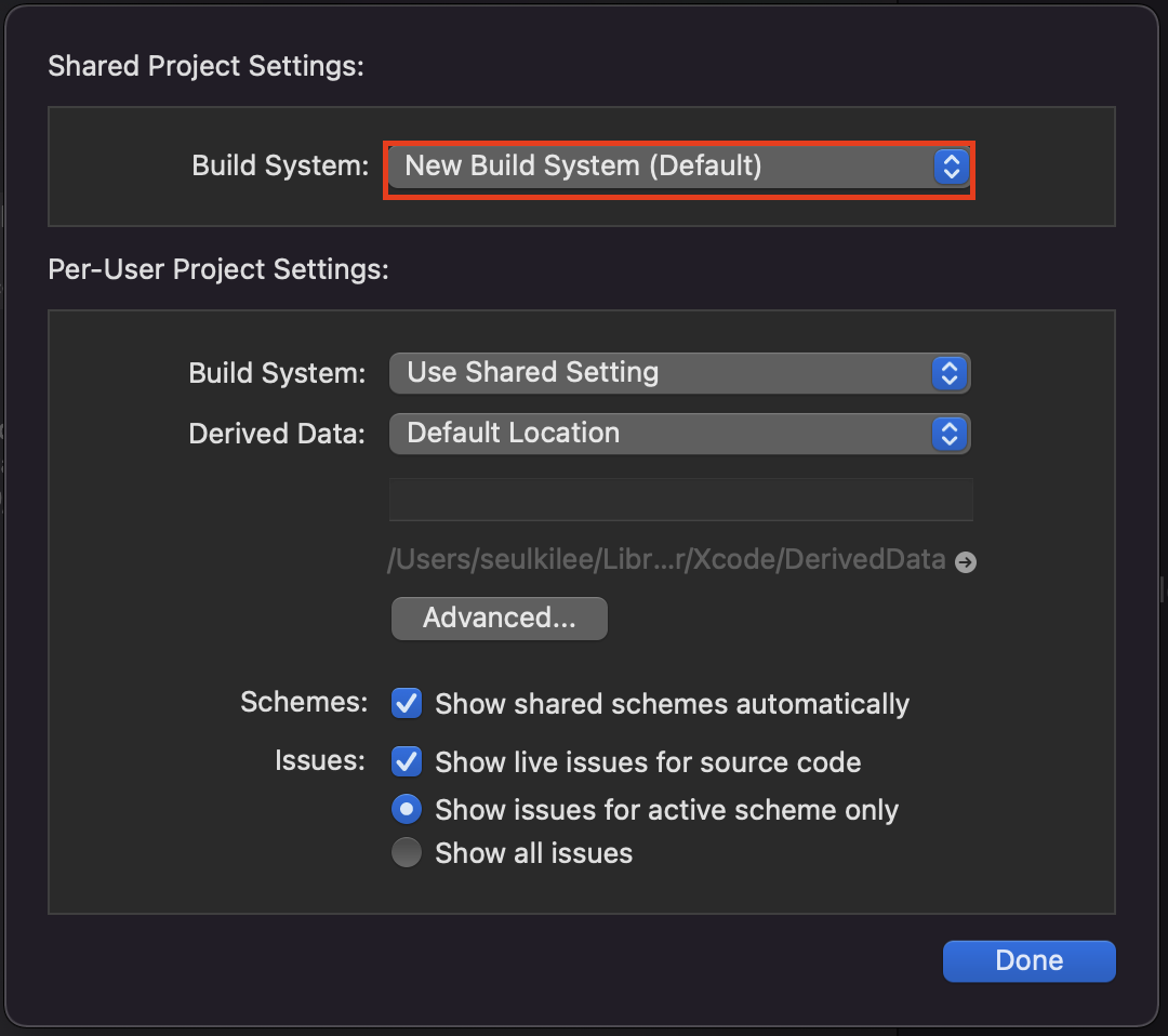 Xcode error - The Legacy Build System will be removed in a future release. You can configure the selected build ststem and this deprecation message in File > WorkSpace Settings. 본문