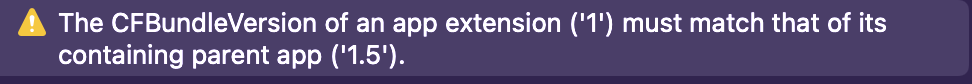 [xcode error] The CFBundleVersion of an app extension ('1') must match that of its containing parent app ('1.5')